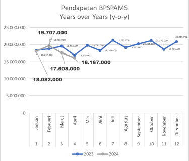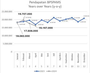 Pada bulan april 2024 ini mulai ada penurunan pendapatan karena ada pengurangan jumlah pelanggan yang cukup signifikan. Dimana terjadi penurunan pendapatan sebesar 8,2% dari bulan sebelumnya. Jika kita melihat diagram pendapatan BPSPAMS diatas, sudah 2 bulan ini terjadi tren penurunan pendapatan. Meski begitu, unit ini mampu menghemat pengeluaran sebesar 6,2%. Kedapannya unit usaha Pamsimas akan terus memaksimalkan pelayanan kepada pelanggan. Di bulan April 2024 ini, BPSPAMS mencetak laba bersih (net income) sebesar Rp 4.676.000. Untuk perbandingan years over years (y-o-y), BPSPAMS mencatat penurunan pendapatan sebesar 4,8% pada bulan yang sama tahun sebelumnya, dimana bulan April 2023 sebesar Rp 16.905.000 dan di bulan April 2024 sebesar Rp 16.167.000.