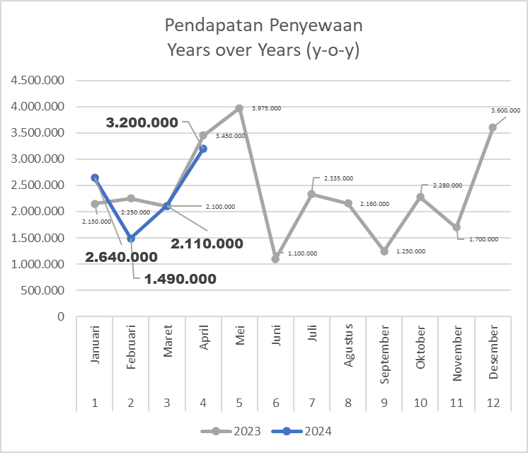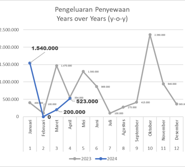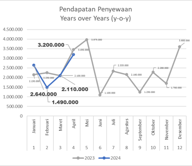 Pada bulan April 2024, terjadi kenaikan pendapatan yang cukup signifikan yaitu sebesar 51,7% dari bulan sebelumnya yaitu sebesar Rp 3.200.000. Persewaan kipas menyumbang 45,3% pendapatan sedangkan mobil 54,7%. Hal ini cukup menggembirakan akan perkembangan persewaan kipas uap yang mulai menunjukkan pertumbuhan positif. Indikatornya adalah peningkatan pendapatan dan peningkatan jumlah kerjasama dengan para vendor. Meski begitu terjadi kenaikan pengeluaran yang besar yaitu sebesar Rp 523.000 yang 90,4% digunakan untuk perawatan dan pemeliharaan mobil Luxio (Rp 473.000). Di bulan April 2024 ini unit usaha persewaan mampu mencetak laba bersih (net income) sebesar Rp 2.677.000